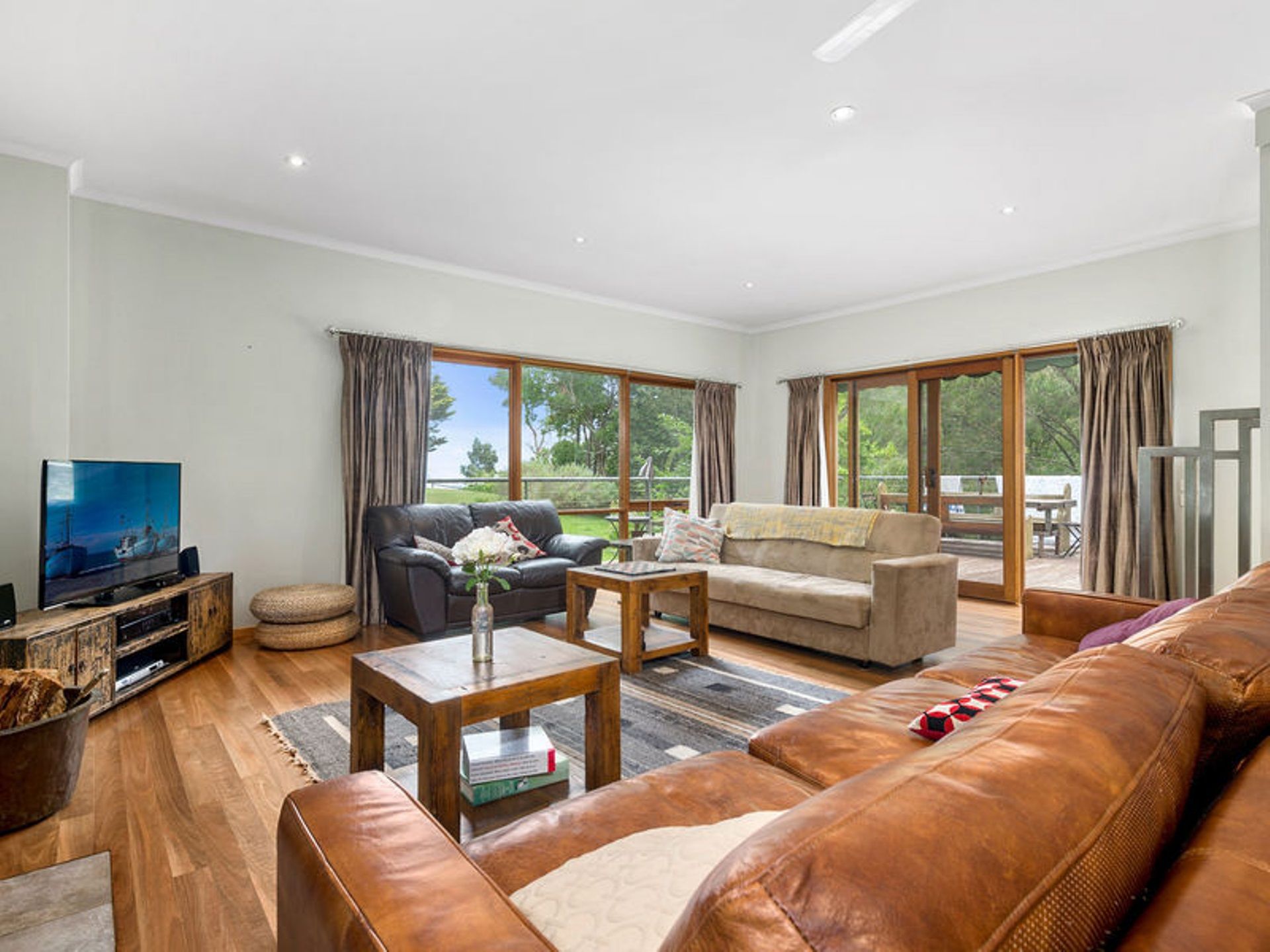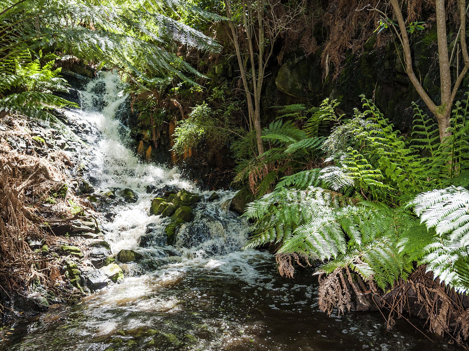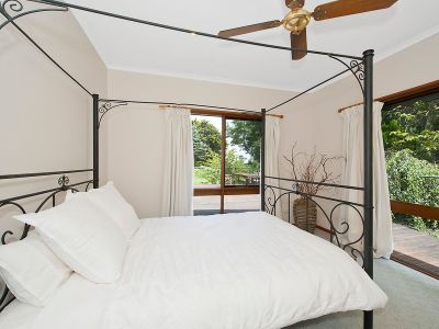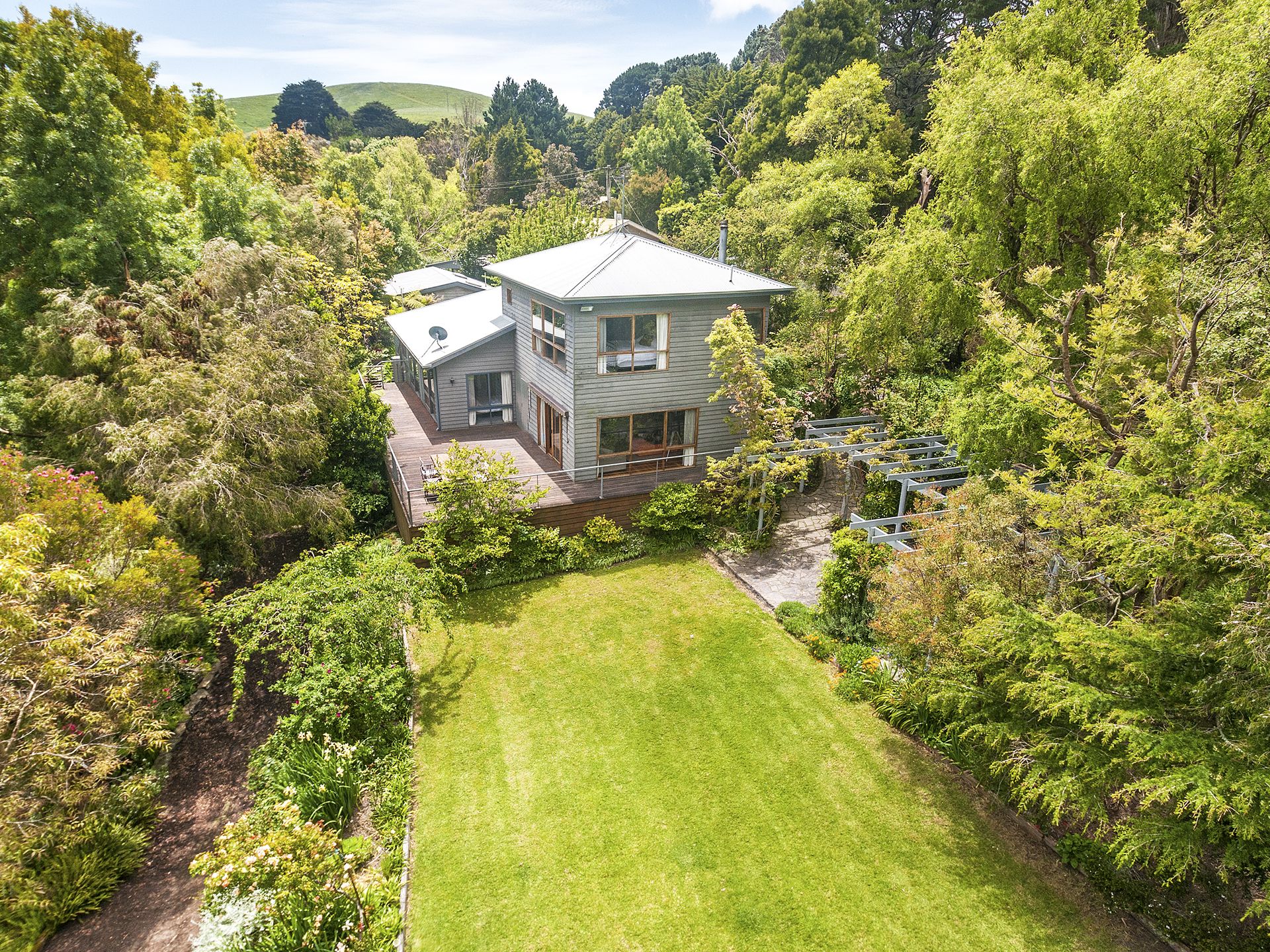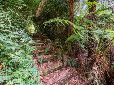 A short walk from the home takes you to a slate paved bbq area, pond, waterfall, rainforest viewing platform and hidden paths taking you through lush green fern gullies and a garden brimming with established exotic trees and acting as a haven for native flora and fauna.