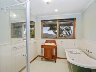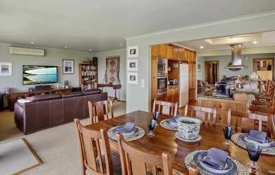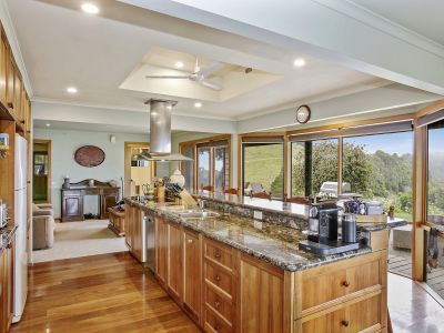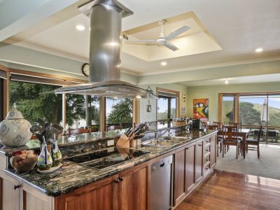 Bursting with character the timber windows to the main house perfectly frame the lush rolling hills from the living space offering wood fireplace, air-conditioning and access to a large timber veranda with spa bath where you can relax and soak in the views of the hills, valleys and ocean. The large galley style kitchen separates the second living area from the dining room and is complete with Peruvian granite benchtops, Miele oven, induction stove and Bosch dishwasher – the perfect place for large family gatherings.