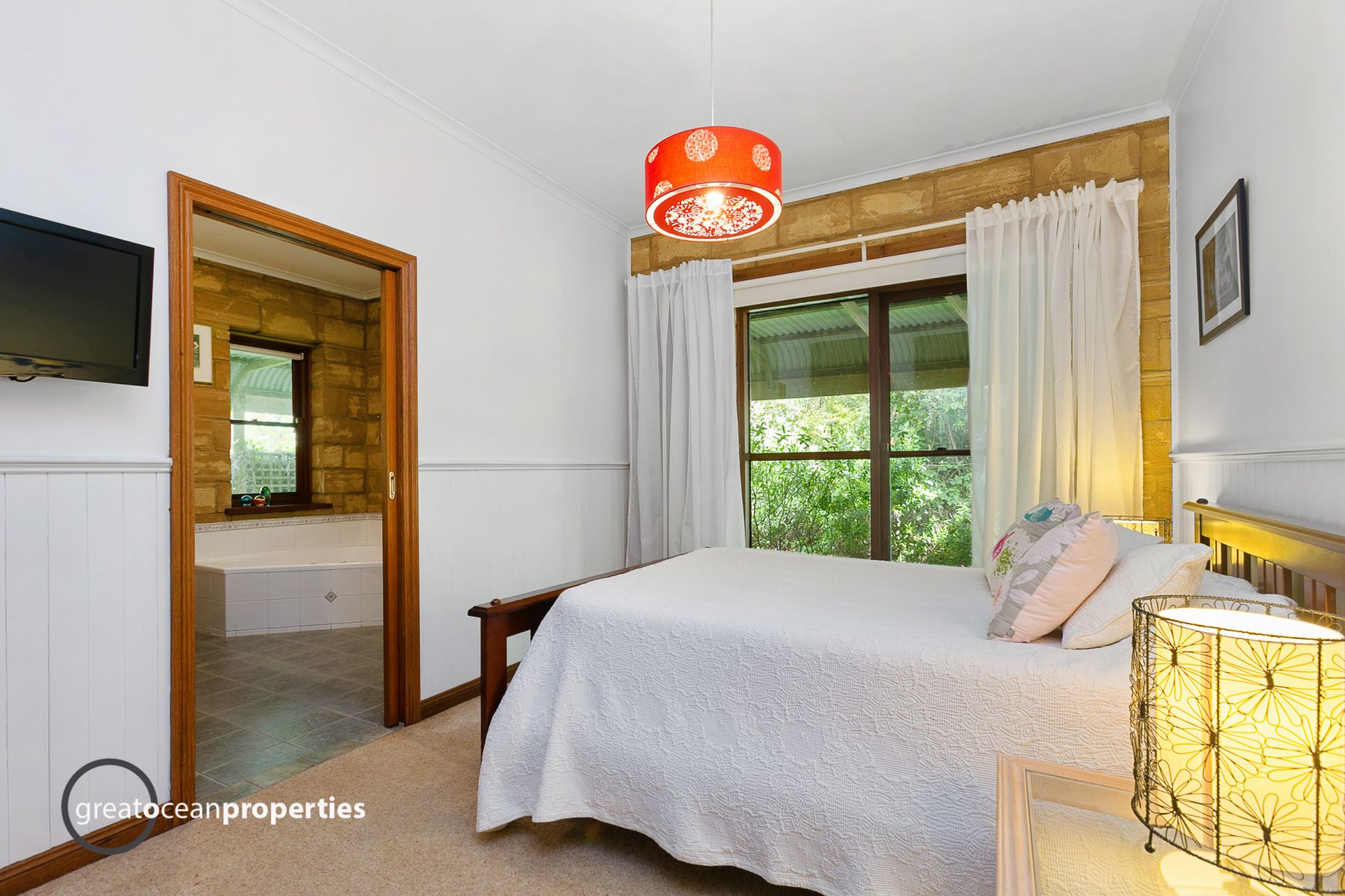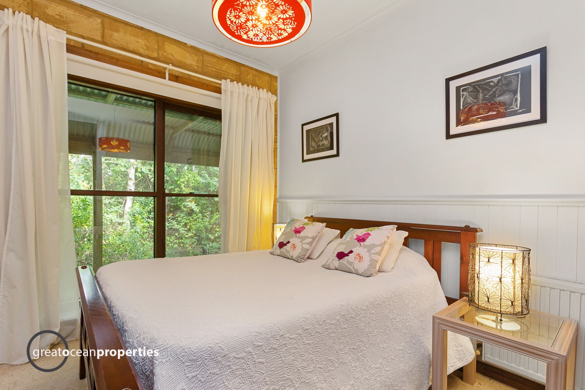 The bedroom wing leads off the living area, and two large double carpeted bedrooms with built in robes, dado blackwood panels and big windows to the verandah views.