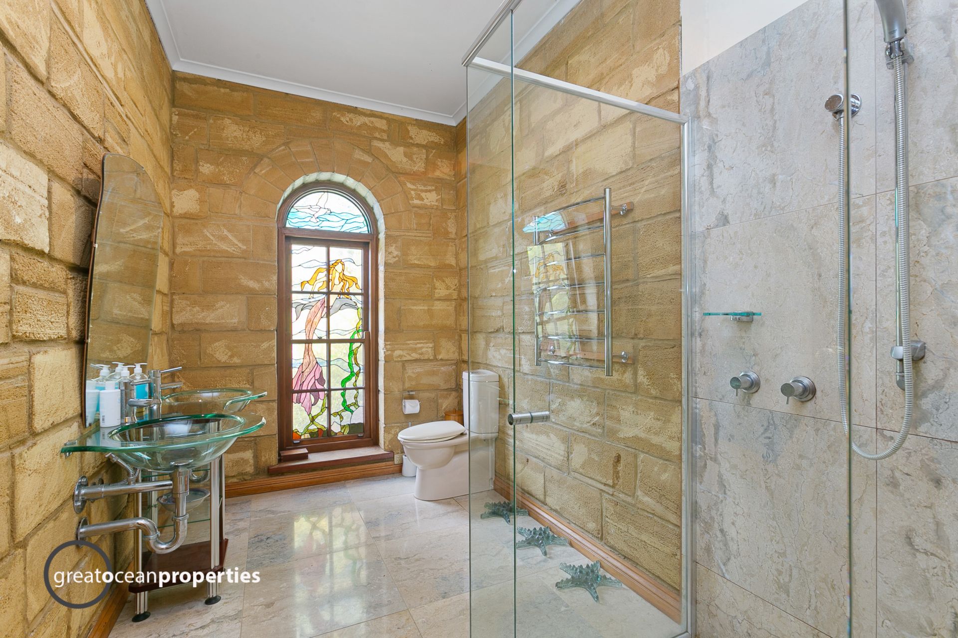 The master bedroom has a separate built in wardrobe space near the ensuite bathroom, with subtle marble tiling, striking leadlight glass panel, walk in shower, double glass bowl contemporary vanity and toilet.