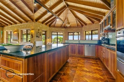 All on one level it has large timber verandahs around all sides with wide bullnose verandah roofing, and great outdoor entertainment space off the lounge. Entering up the steps from the front deck is the spacious living area with high blackwood cathedral ceilings, handmade local parquetry floors, and a combustion wood heater. The dining room extends in a bay window to the east, looking across the Aire River valley, with the large blackwood and granite benchtop kitchen adjacent. The kitchen has hands-free basin and double sink, Bosch dishwasher, Miele gas cooktop and Smeg electric oven. There is an additional Raeburn Royal wood stove and large floor to ceiling walk-in pantry.