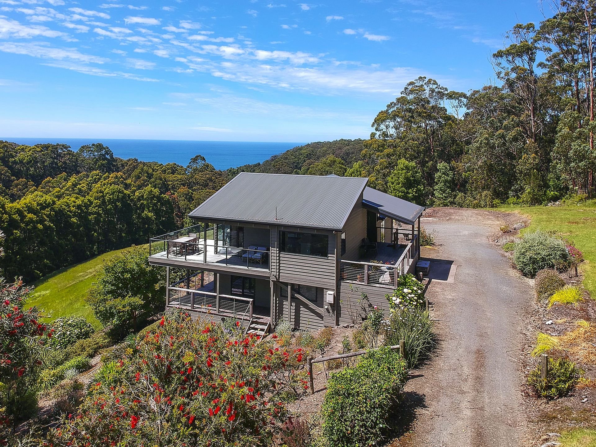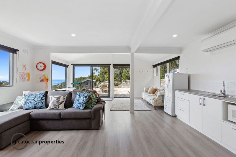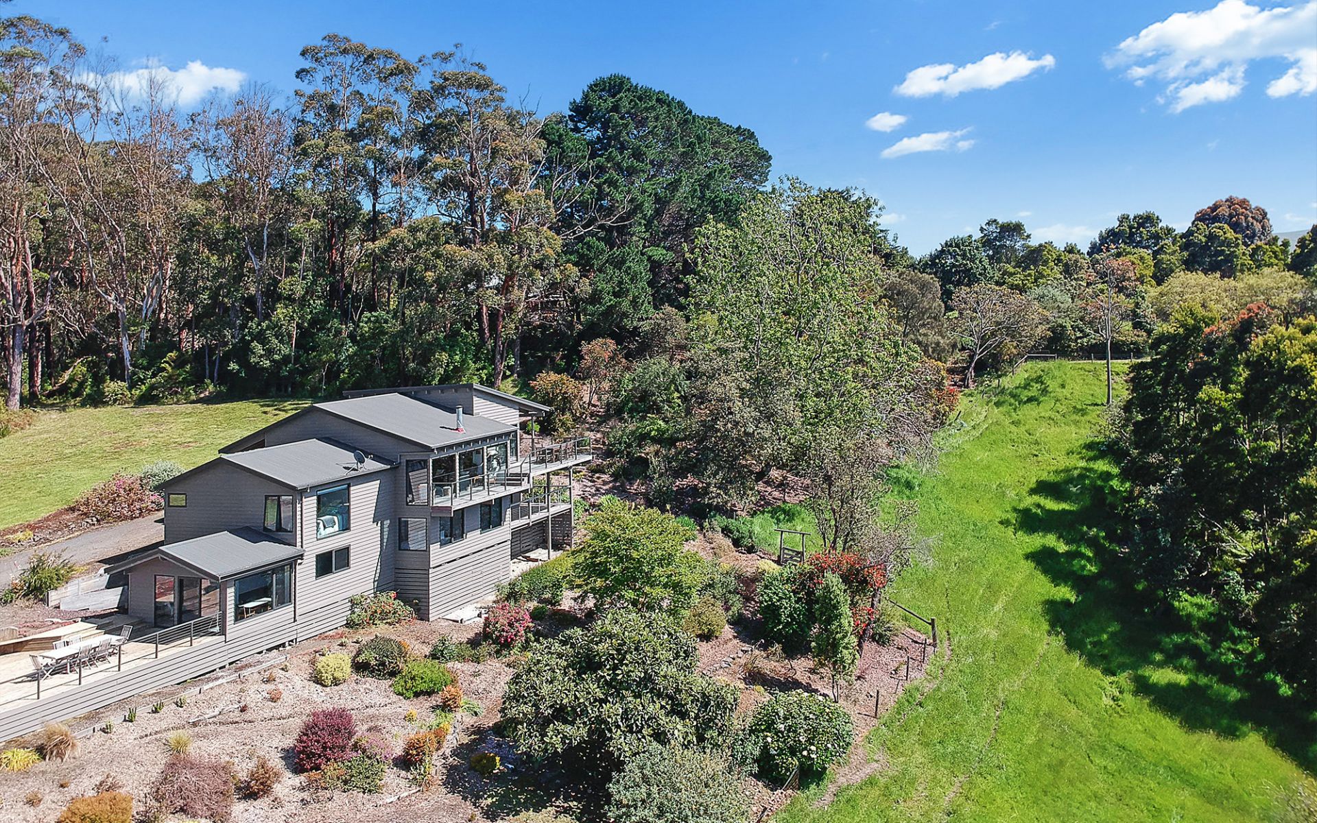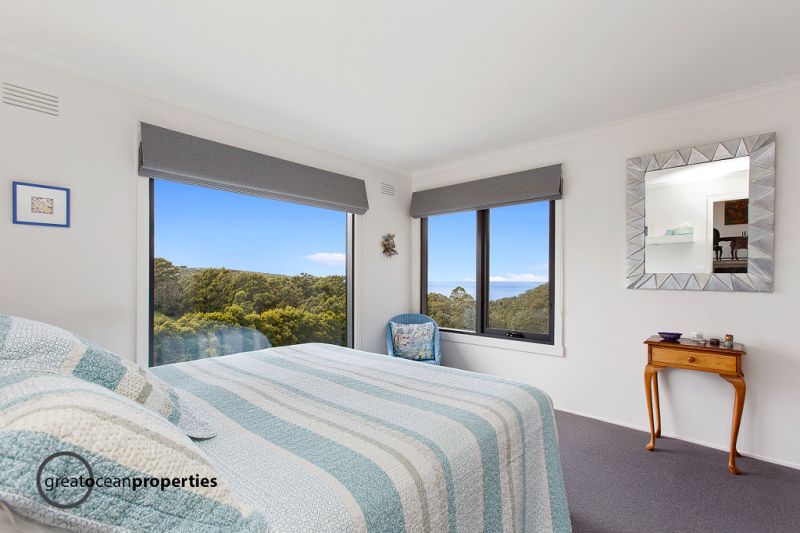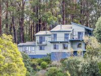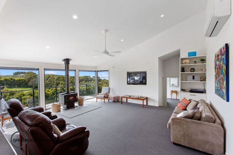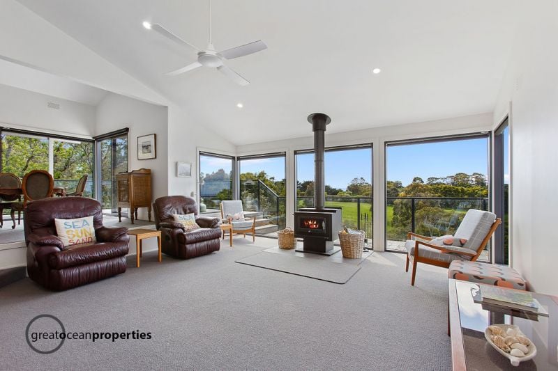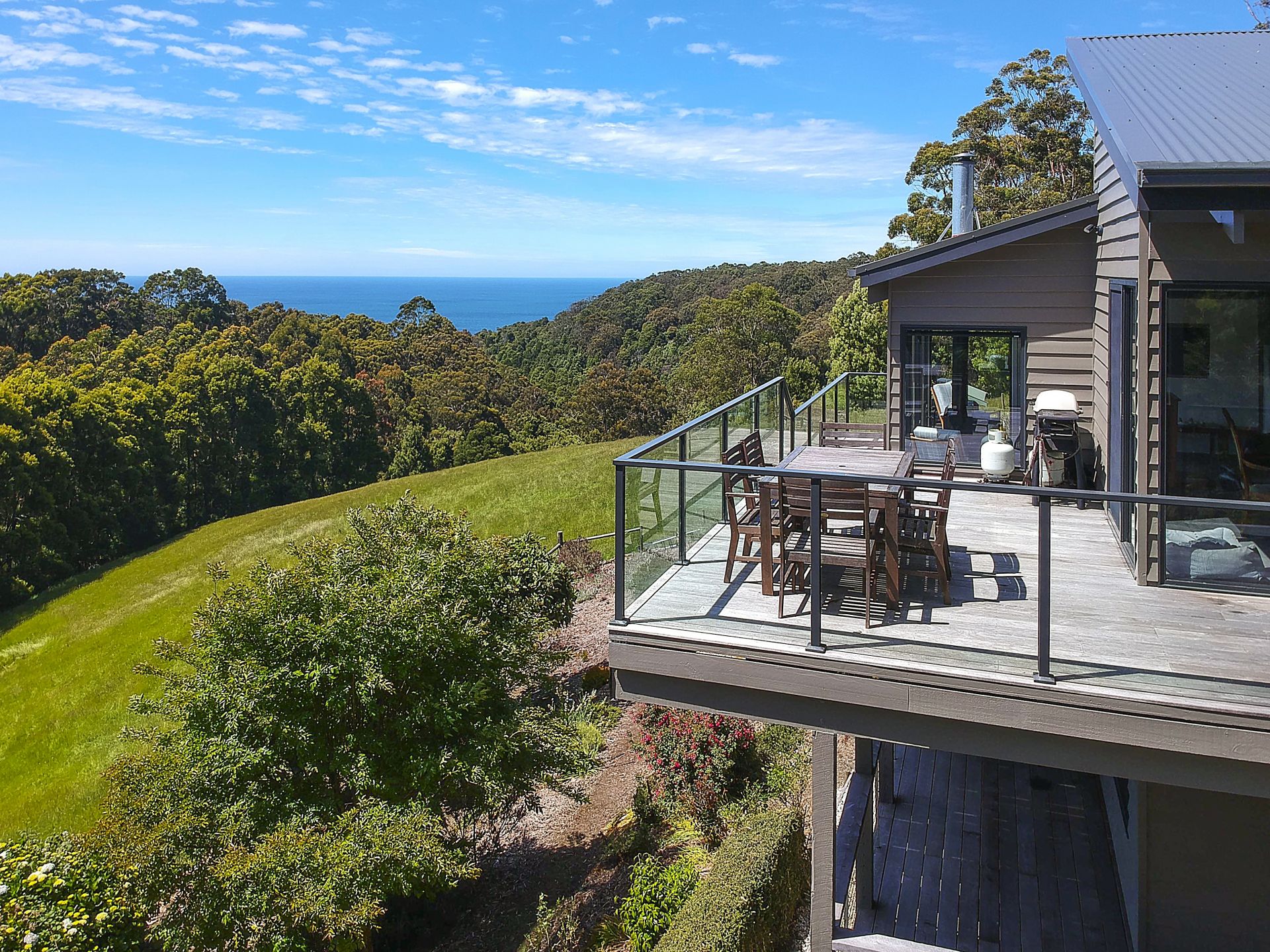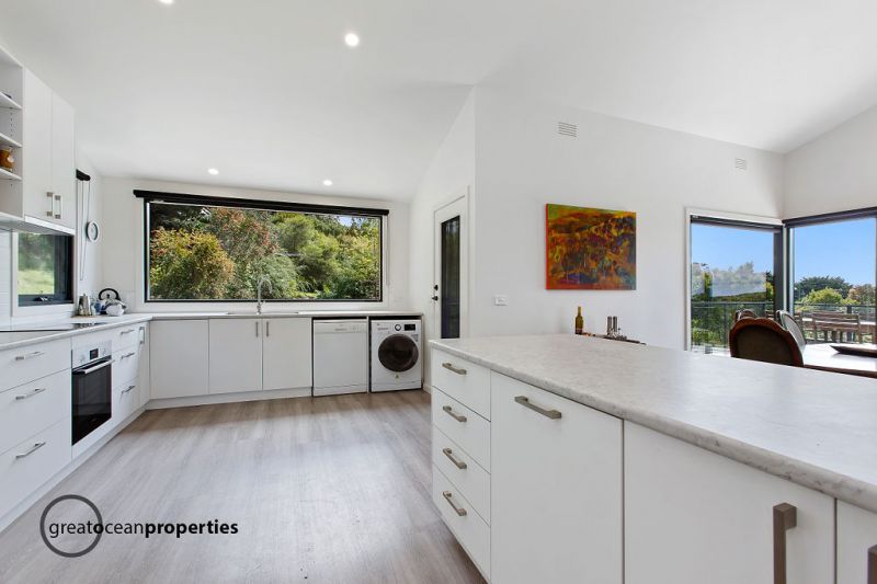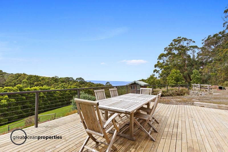 Set high on the hills with a spectacular view of the ocean and the rolling pastures and forests, this solid five-bedroom, 3 bathroom, two living area home is on 10 acres of land (4 ha) and is less than 6km from Apollo Bay. This house has recently been fully renovated, so now has all double-glazed windows, 4 new decks, new bathrooms, new floors and re-painted inside and out. There has been a lot of upgraded electrical work with down lights and ceiling fans, there is a large wood heater and split air-con systems up and down stairs.