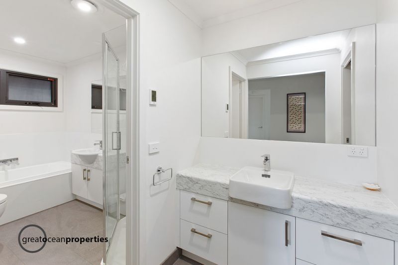 The upper level has a naturally lit open plan living area with sunken living room, sea views and a woodfire box that radiates the whole space. Just off the living area is a large linen storage cupboard providing ample storage for the house. There is a separate adjacent large kitchen with generous sized pantry, ‘induction’ cook top, electric oven, stainless steel sink, dishwasher and front-loading washer/dryer. The master bedroom comes with walk in robe, heating and ensuite has amazing views of the ocean. There is also a second bedroom/office on this floor, a powder room and a stunning wrap around deck taking in the views of the whole property.