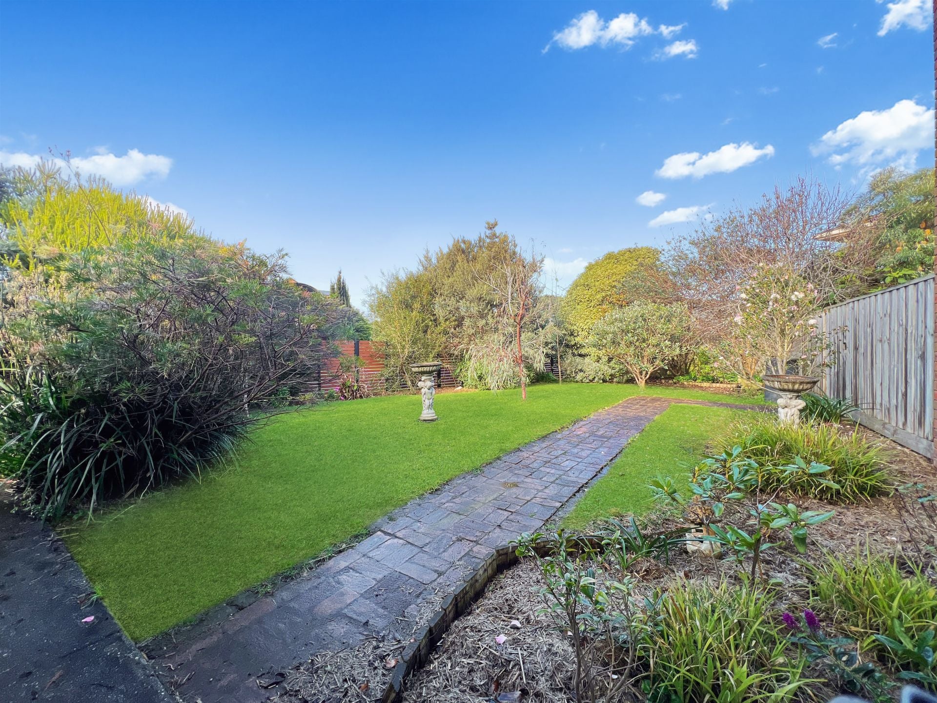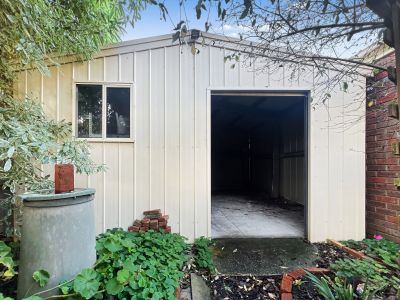 o Outside, a powered concrete-slab shed is located within the established gardens, offering additional storage or workspace.