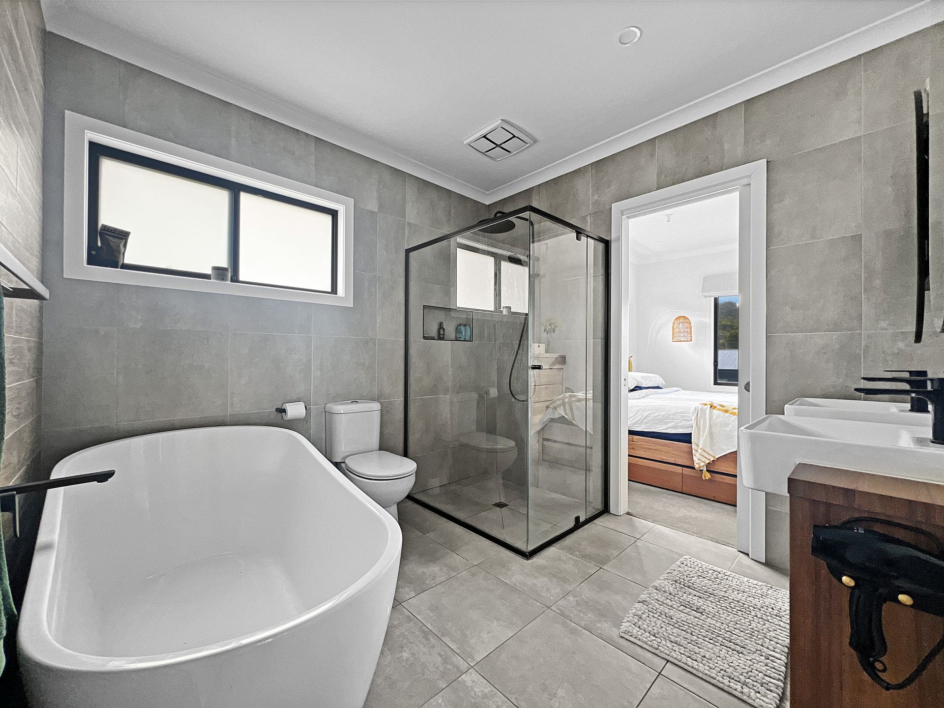 Upstairs, there are three bedrooms, two with built-in robes, along with a large family bathroom. The focal point of this house, however, is the open plan kitchen/dining/living space, which opens out onto an expansive timber deck, perfect for entertaining and soaking up those views.