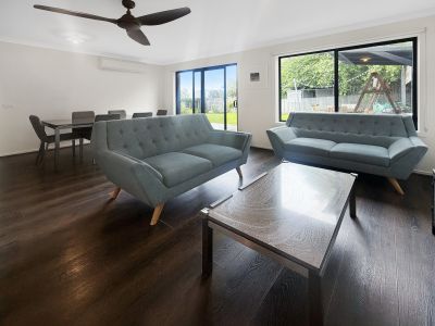 The master bedroom is spacious, featuring a walk-in robe and ensuite, while the additional bedrooms include built-in robes for ample storage. The heart of the home is the open-plan living and dining area, seamlessly flowing to a large timber deck overlooking the private rear garden. The well-appointed kitchen boasts modern appliances, a walk-in pantry, and plenty of bench space, making it ideal for entertaining. A second bathroom with a separate toilet, a full laundry, and a cleverly designed study nook add to the home’s functionality.