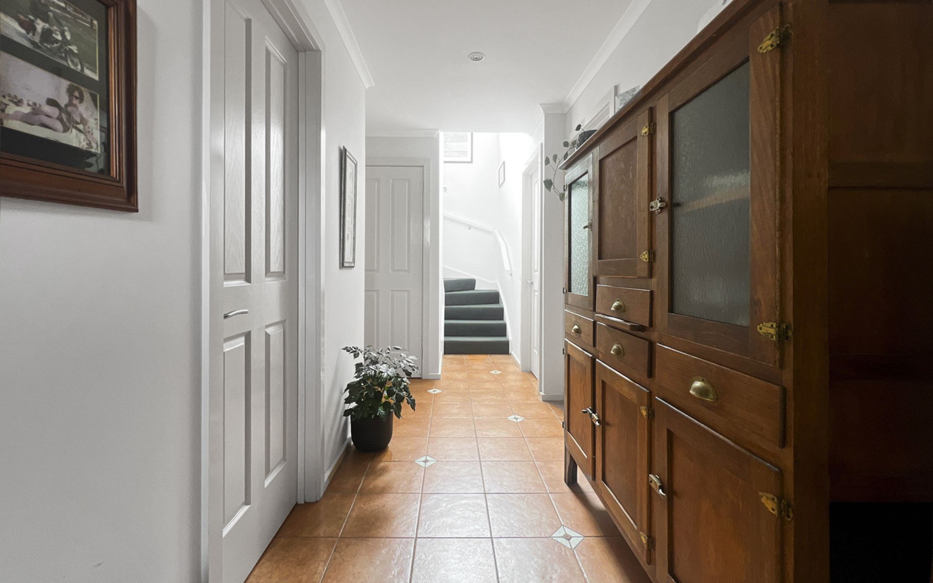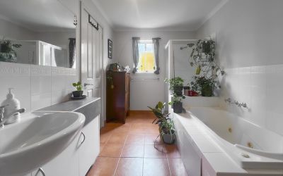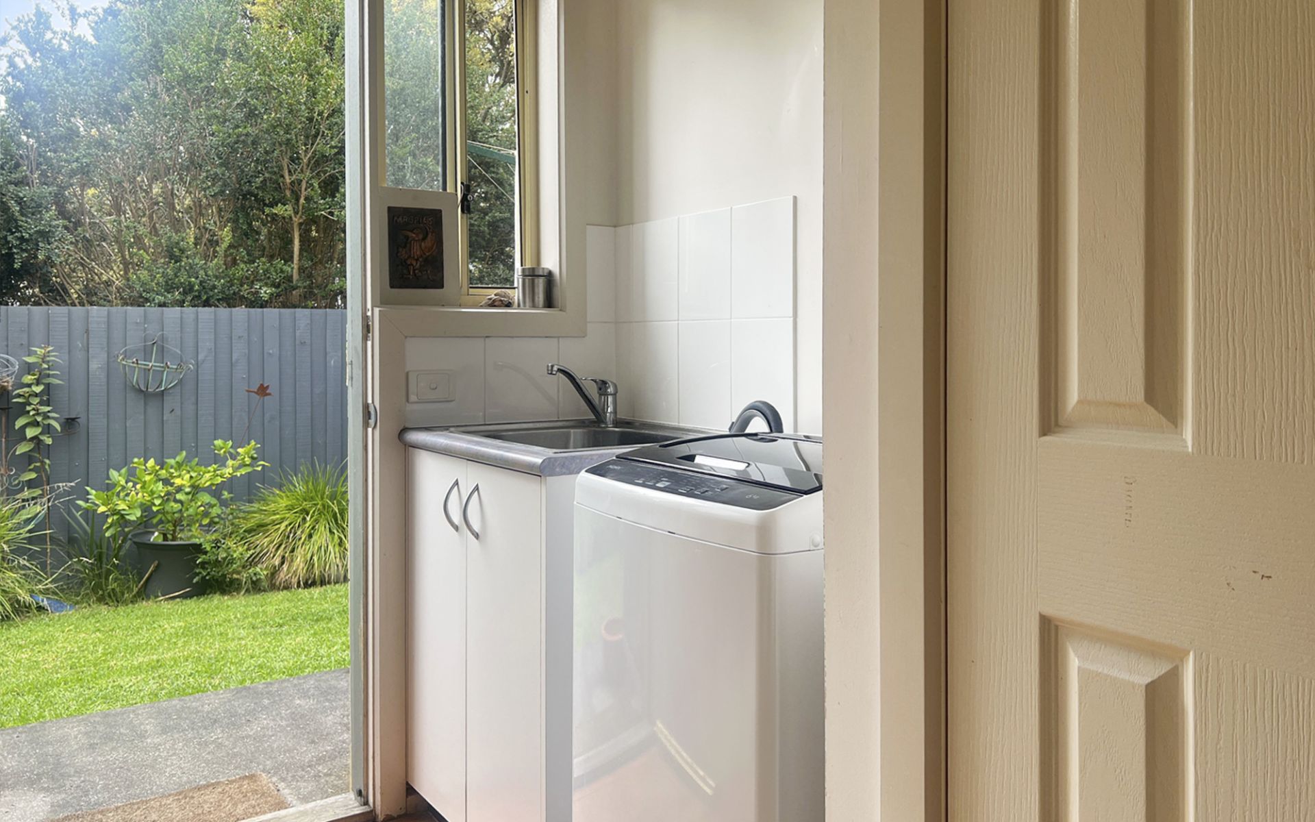 Downstairs, two well-appointed bedrooms come with built-in wardrobes, offering ample storage. The large family bathroom includes a shower, bath, vanity, and toilet. The single lockup garage, currently set up as a third bedroom or office, provides flexibility to suit your needs. A full laundry with generous storage space ensures practicality, while the compact fenced garden, complete with lawn and garden beds, adds a touch of natural greenery.