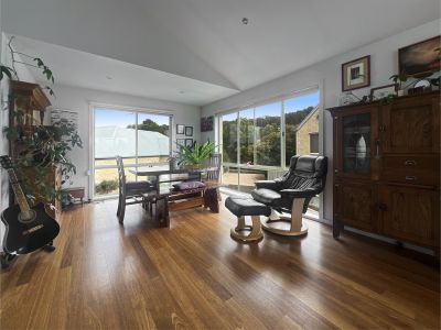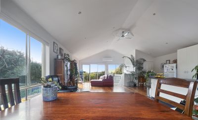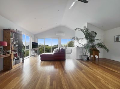 The top floor features a spacious open-plan design, easily integrating the kitchen, dining, and living areas. With polished timber floors, reverse cycle air conditioning, a ceiling fan, and large north-facing windows, this level is both bright and inviting. A fully functional kitchen makes meal preparation effortless, while the balcony provides a relaxing space to enjoy ocean views in the distance. A convenient powder room completes this level.