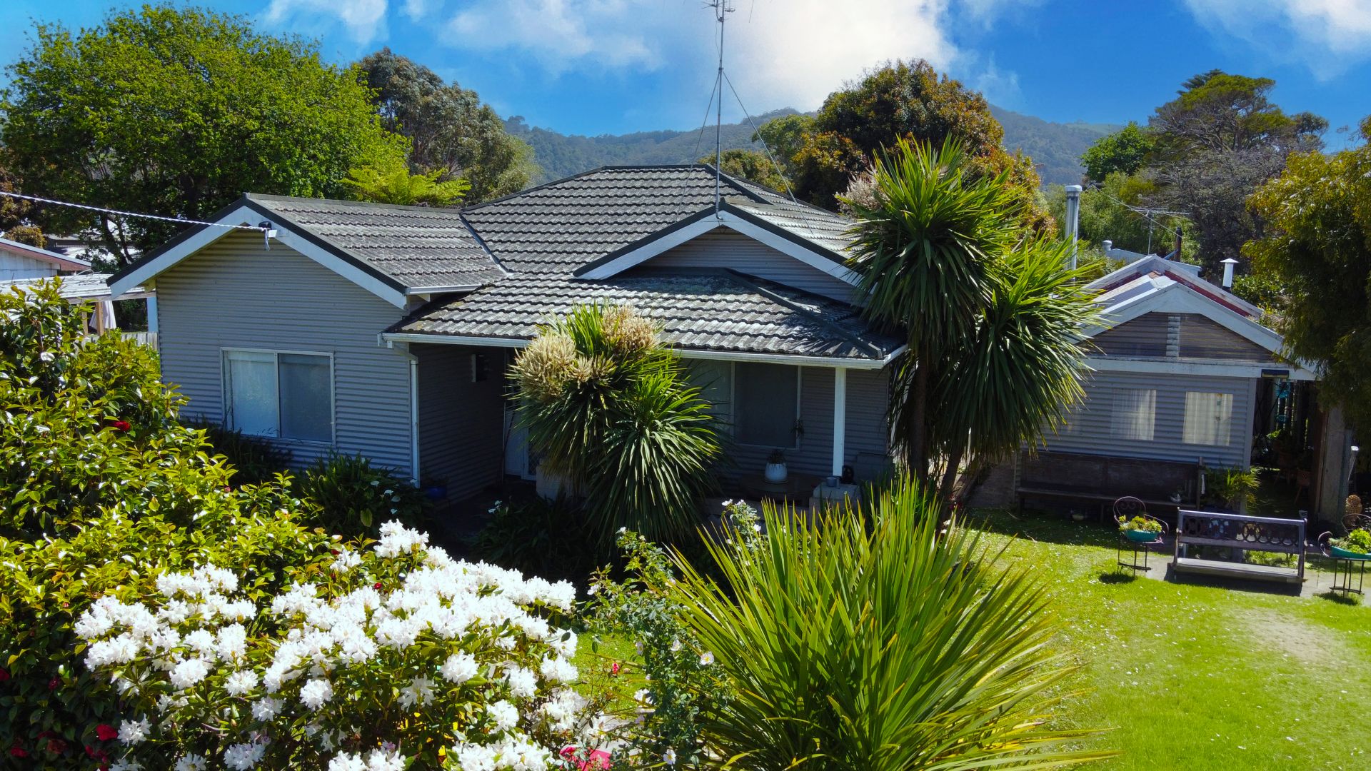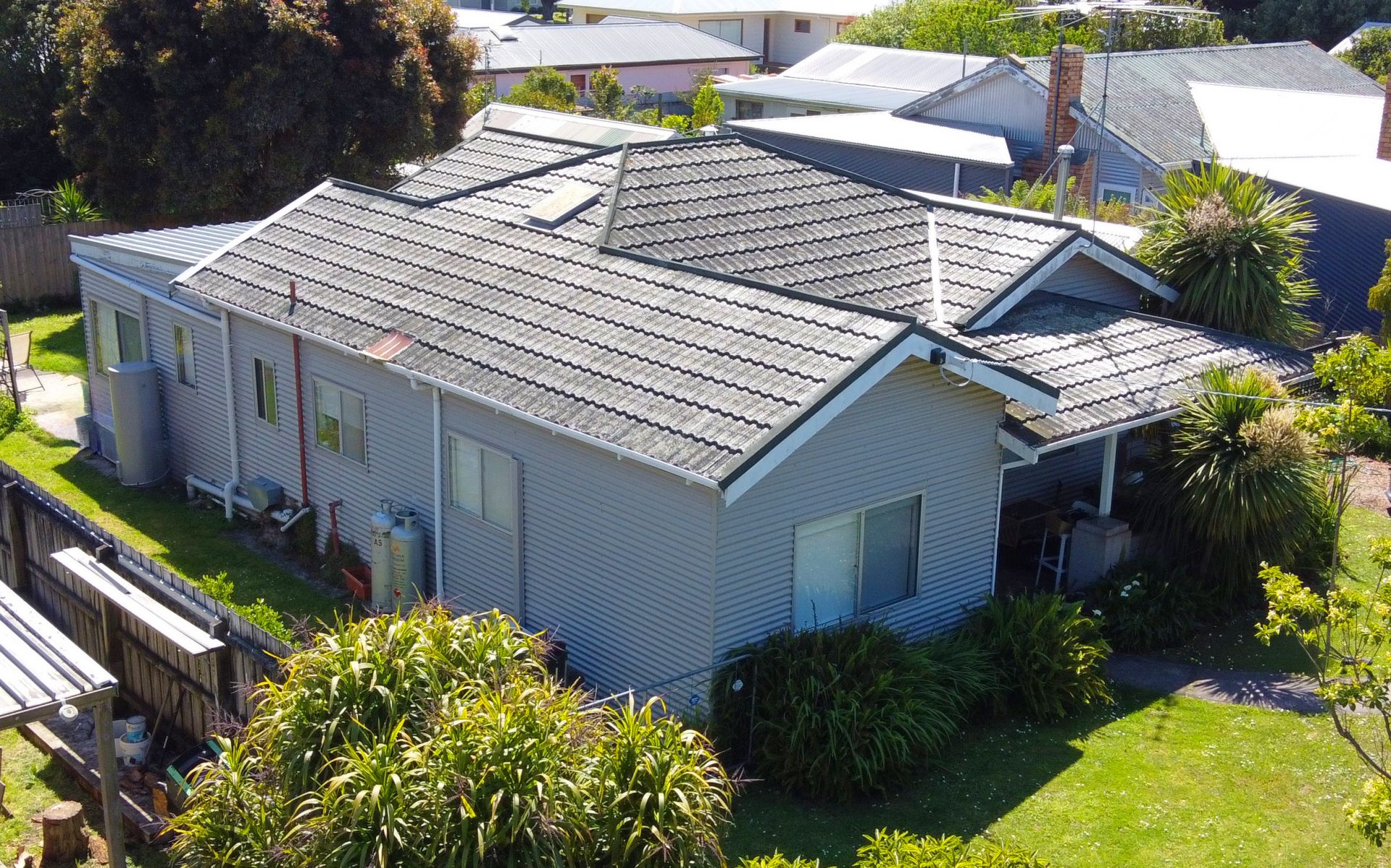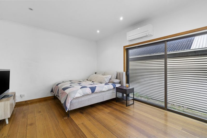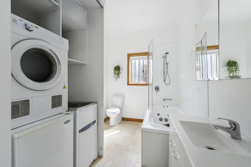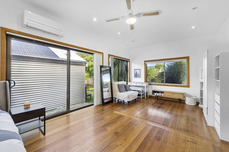 The main residence, a solid 1970s-era home recently re-clad in Colorbond, includes three bedrooms—one of which is notably oversized—a comfortable and sun-drenched rear lounge room, and a combined bathroom and laundry. The original kitchen retains its retro charm, while two split-system air conditioners ensure year-round comfort.