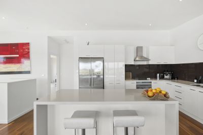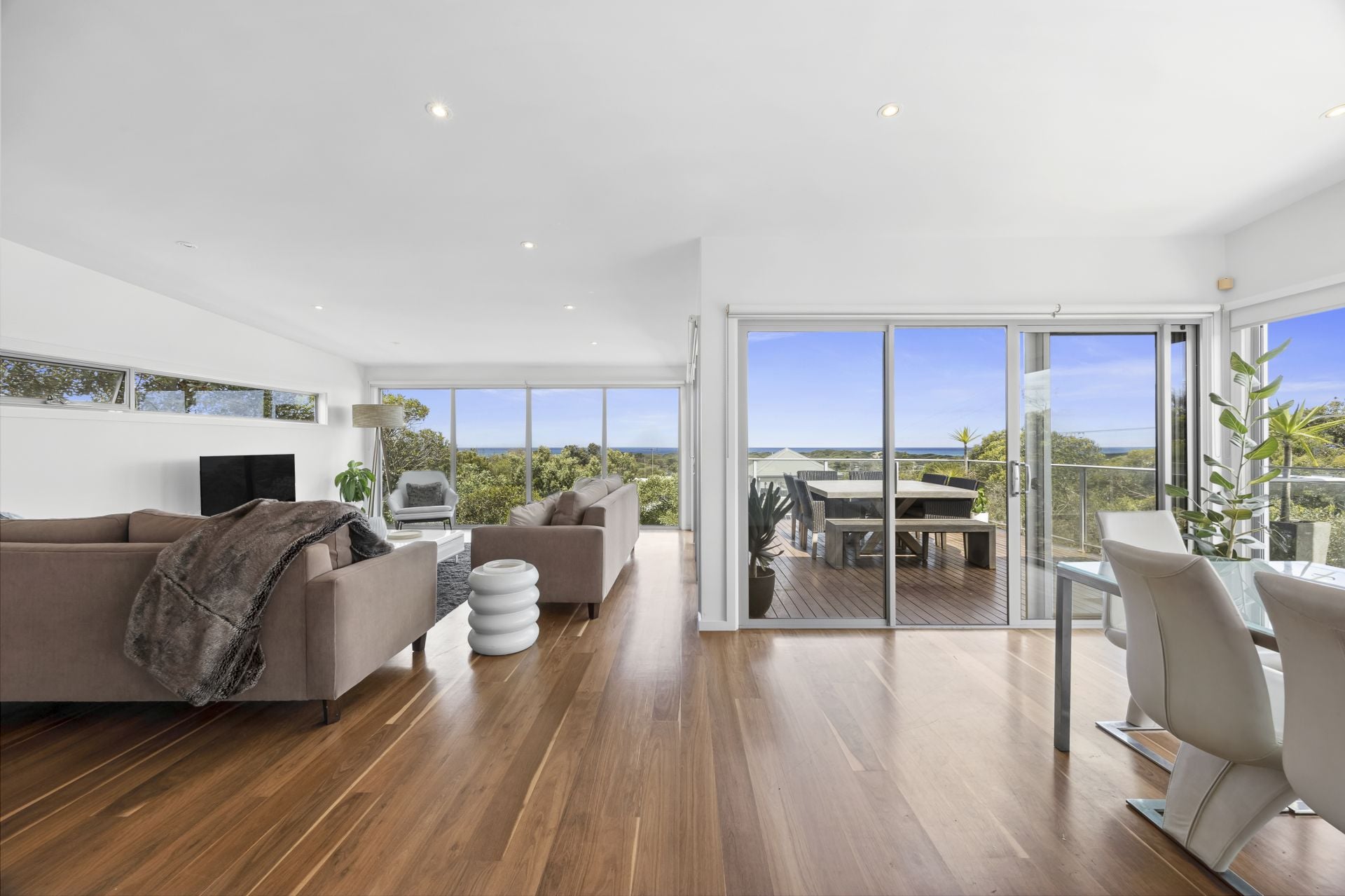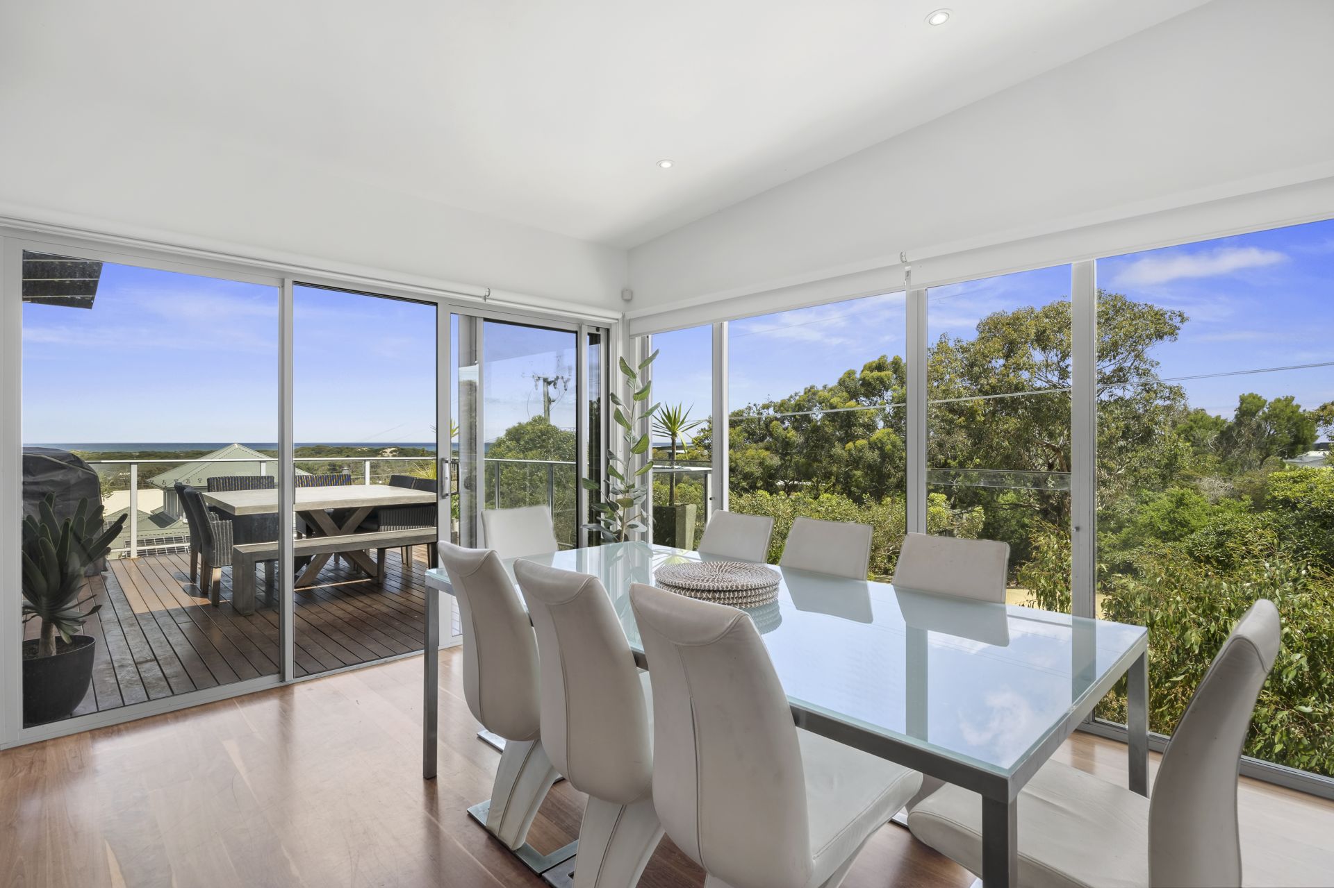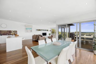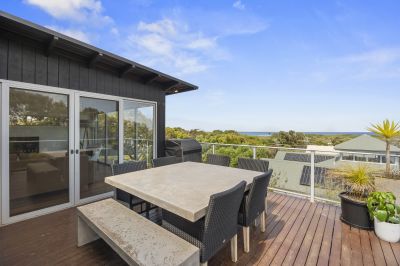 Positioned in one of Anglesea’s most desirable precincts, this contemporary four bedroom residence offers an exceptional coastal lifestyle with expansive ocean views including clear sightlines to the surf breaking over Point Roadknight. From sunrise colours across the water to watching sets roll in, the outlook becomes part of your everyday living experience. Designed with space and comfort in mind, every room in the home is impressively generous in scale. The upper level open plan living zone is a standout - light filled, inviting and oriented to capture both the views and the warming northern sun. Stunning Spotted Gum timber floors flow throughout, creating a calm, natural feel that suits both relaxed holiday time and effortless year-round living. The second living area downstairs adds valuable flexibility, ideal for visiting guests, teenagers, work from home needs or simply creating separate zones for entertaining and quiet retreat.