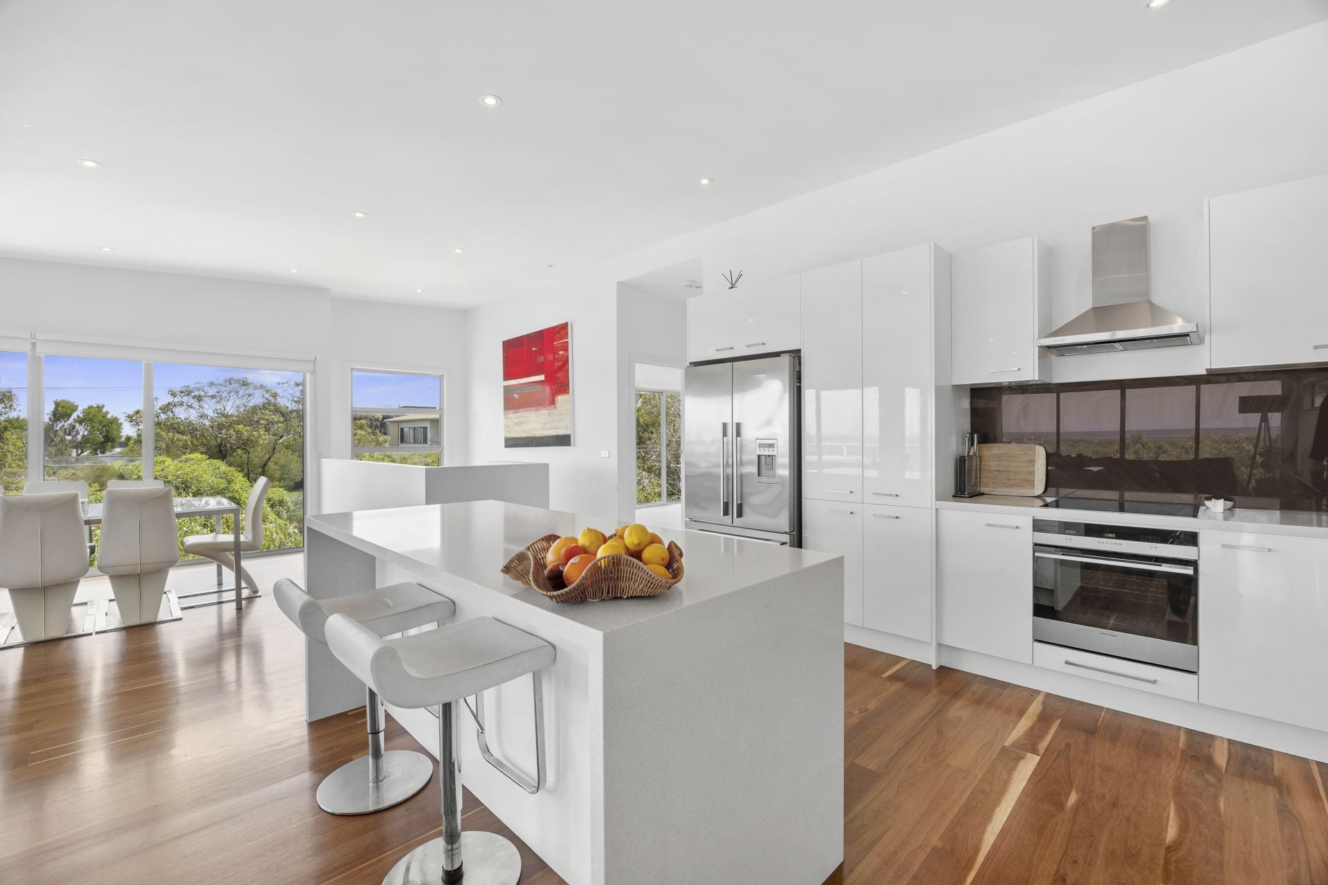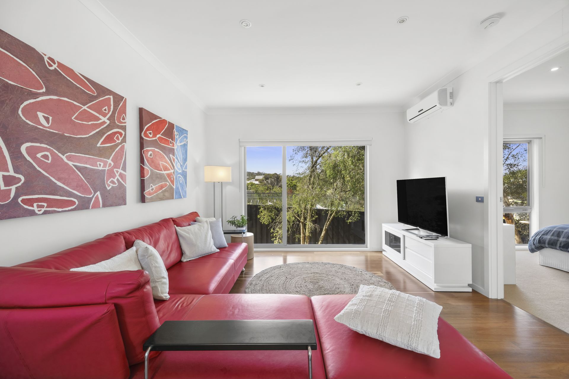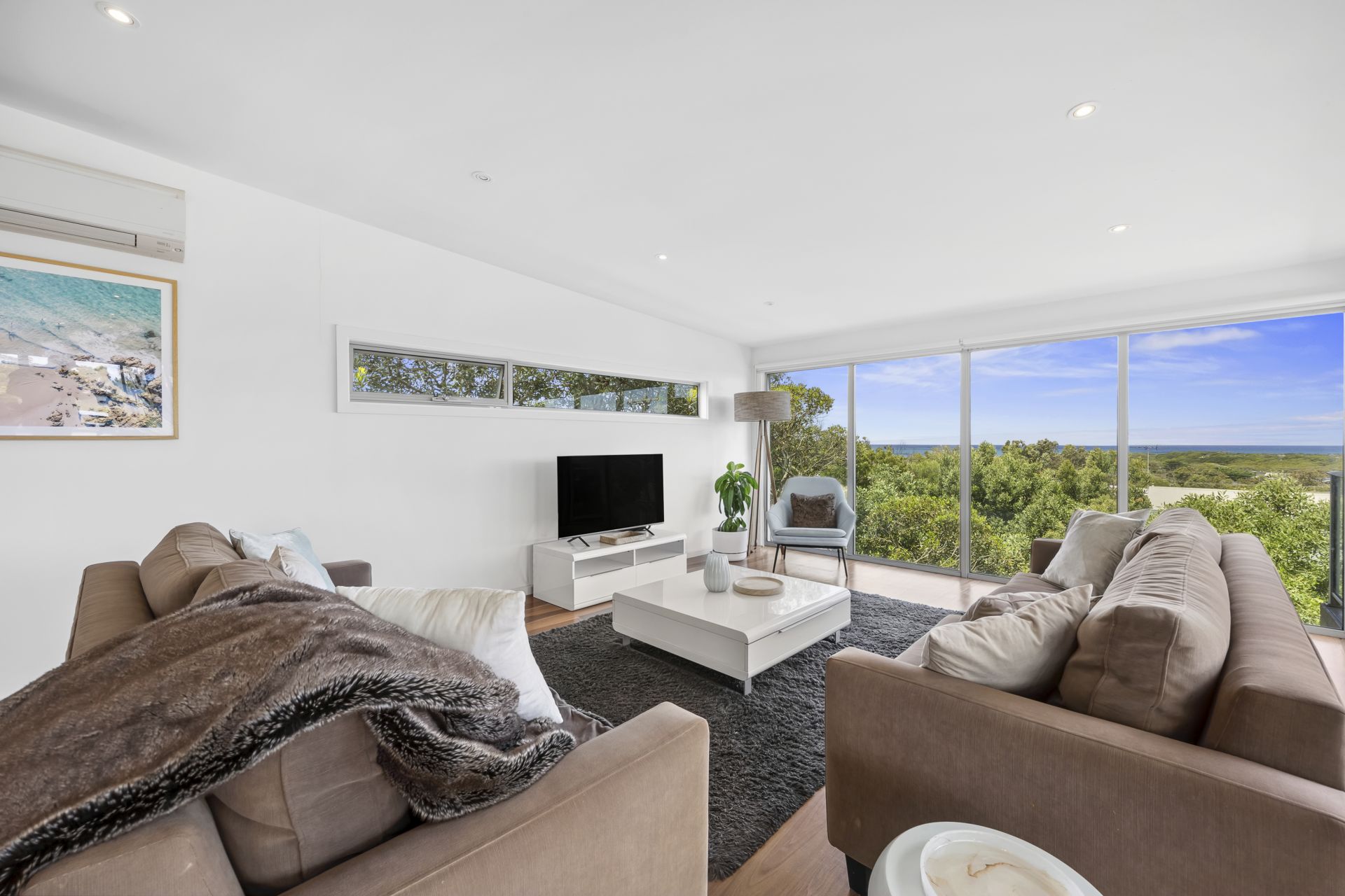 Positioned in one of Anglesea’s most desirable precincts, this contemporary four bedroom residence offers an exceptional coastal lifestyle with expansive ocean views including clear sightlines to the surf breaking over Point Roadknight. From sunrise colours across the water to watching sets roll in, the outlook becomes part of your everyday living experience. Designed with space and comfort in mind, every room in the home is impressively generous in scale. The upper level open plan living zone is a standout - light filled, inviting and oriented to capture both the views and the warming northern sun. Stunning Spotted Gum timber floors flow throughout, creating a calm, natural feel that suits both relaxed holiday time and effortless year-round living. The second living area downstairs adds valuable flexibility, ideal for visiting guests, teenagers, work from home needs or simply creating separate zones for entertaining and quiet retreat.