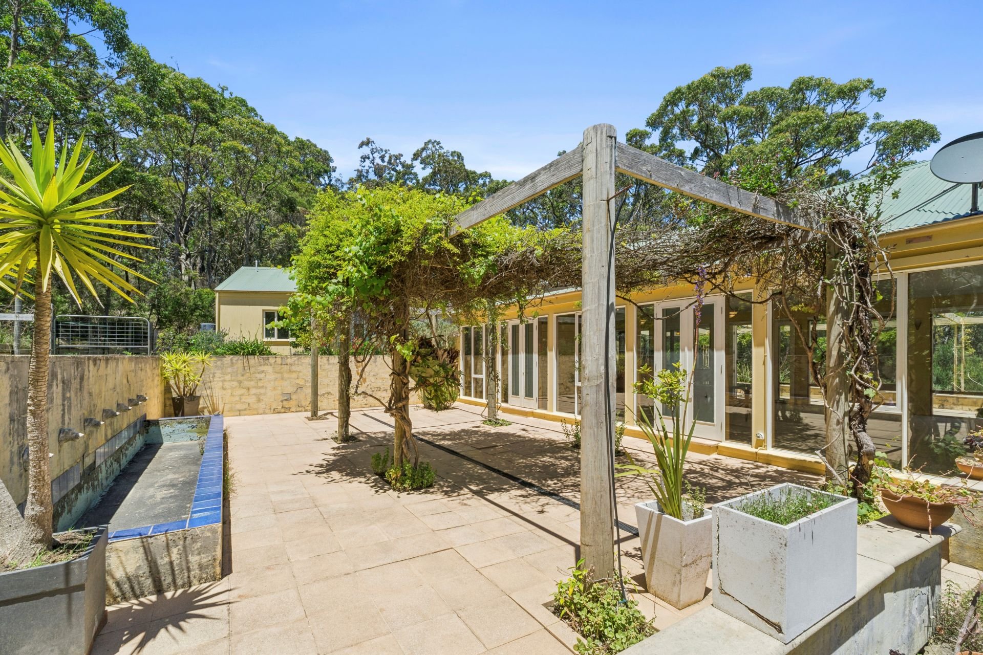 Outside, established gardens and extensive landscaping surrounds the home, with two paved patios and pergolas to the front and rear offering inviting spaces to relax or entertain. Water security is excellent with a 30,000-litre rainwater tank supplying the house, complemented by a 26,000-litre garden tank. A substantial 90 sqm shed with concrete slab and power adds versatility for storage, workshop or hobby use.
