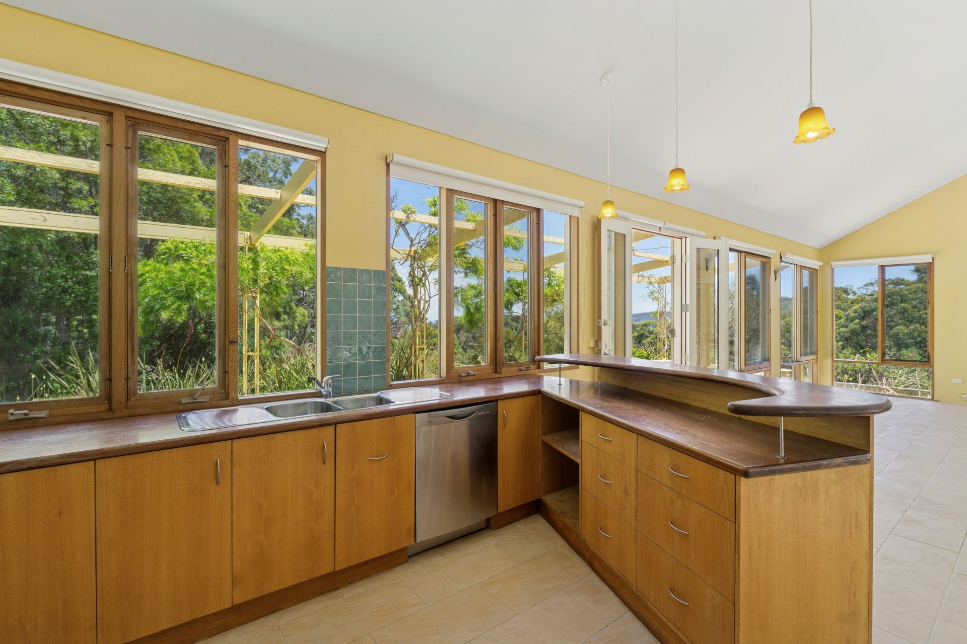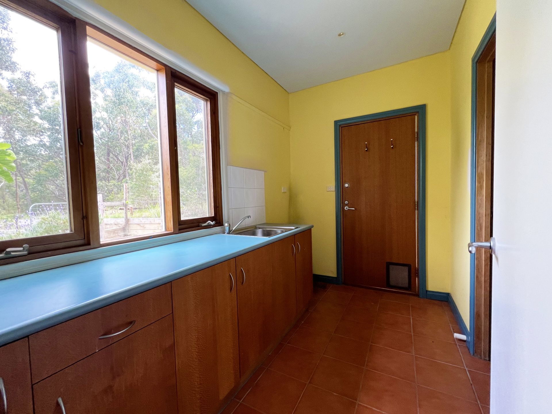 The residence comprises three bedrooms, a central bathroom and an open plan kitchen and living area warmed by underfloor electric heating, a robust wood heater and the comfort of double glazing throughout. Cedar French doors and floor-to-ceiling windows draw abundant natural light into the living space, complemented by art deco wall-mounted sconce lamps that add character and warmth. A reverse cycle split-system air conditioner provides year-round climate control.