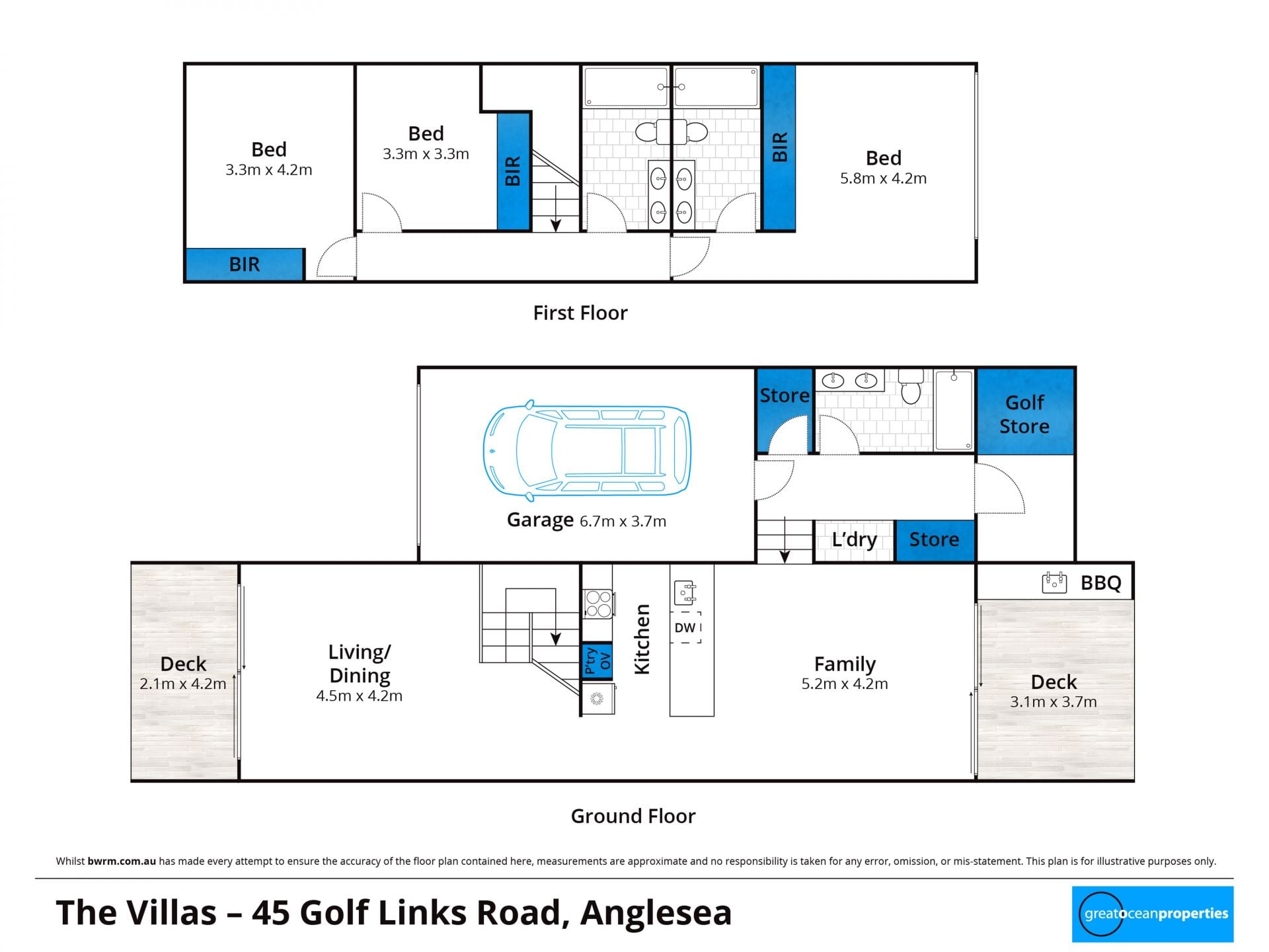 There are three bathrooms in total, including a ground floor bathroom, a family bathroom upstairs and a private ensuite to the main bedroom. Storage has been thoughtfully considered throughout, allowing owners to lock away personal items and maximise rental appeal if desired. A single garage and rear storage room with roller door access easily accommodates surfboards, bikes, golf clubs and beach gear.