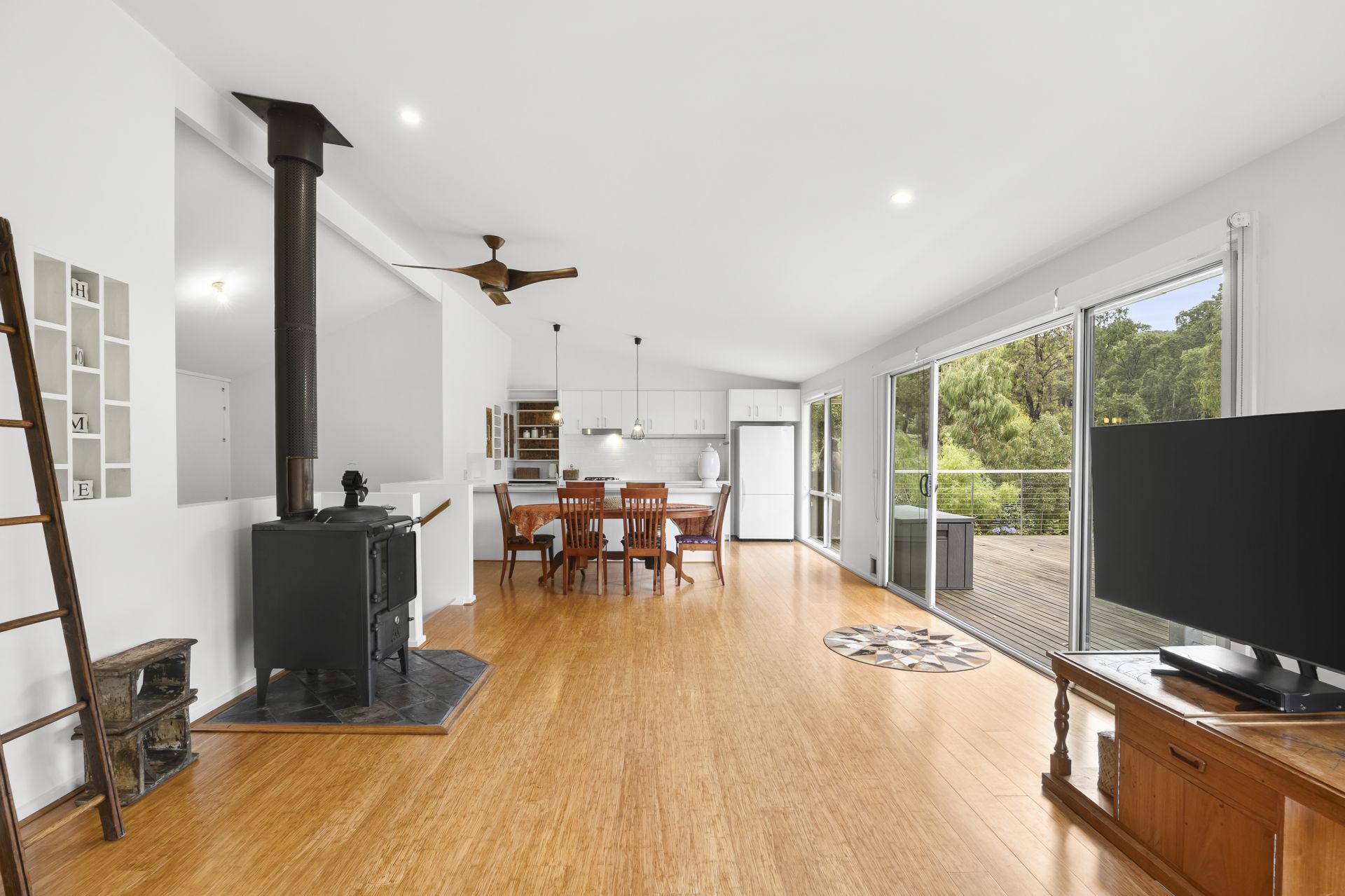 Flowing seamlessly from the living space, an expansive elevated deck sits among the treetops, creating an idyllic setting for entertaining, morning coffee or quiet afternoons spent listening to birdsong. With excellent privacy and a strong connection to the surrounding greenery, this outdoor space becomes a true extension of the home — peaceful, sun-drenched and beautifully sheltered.