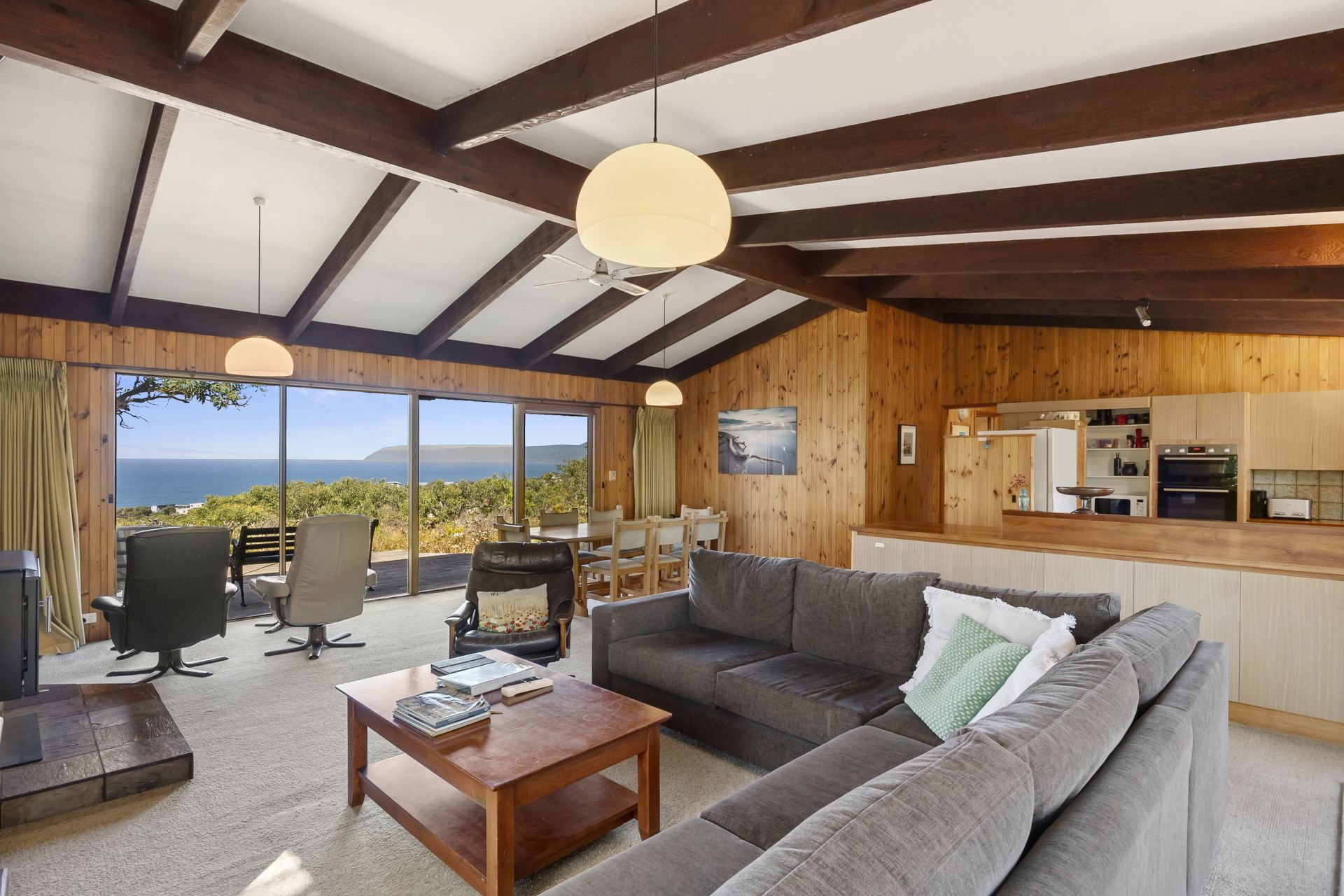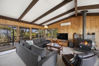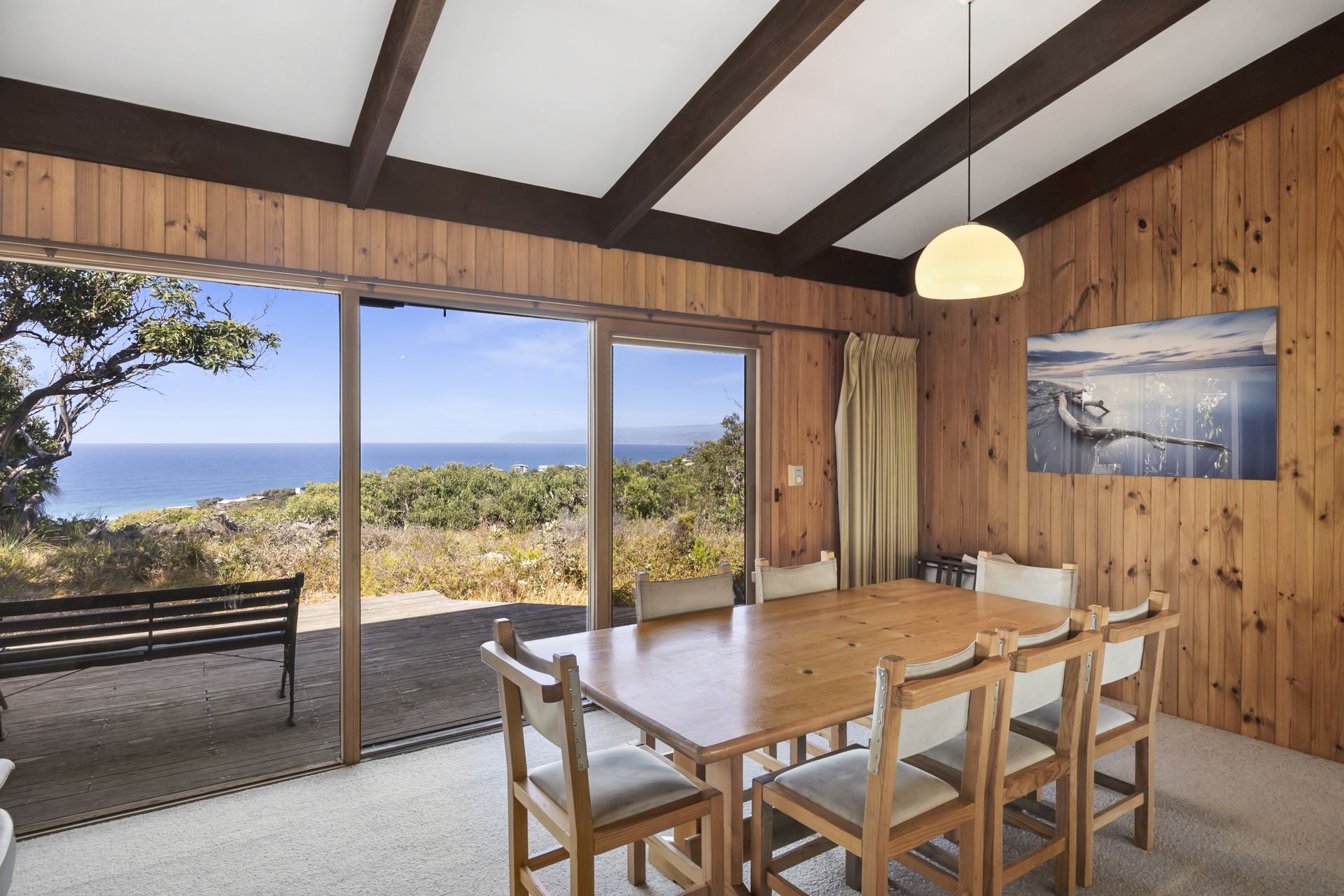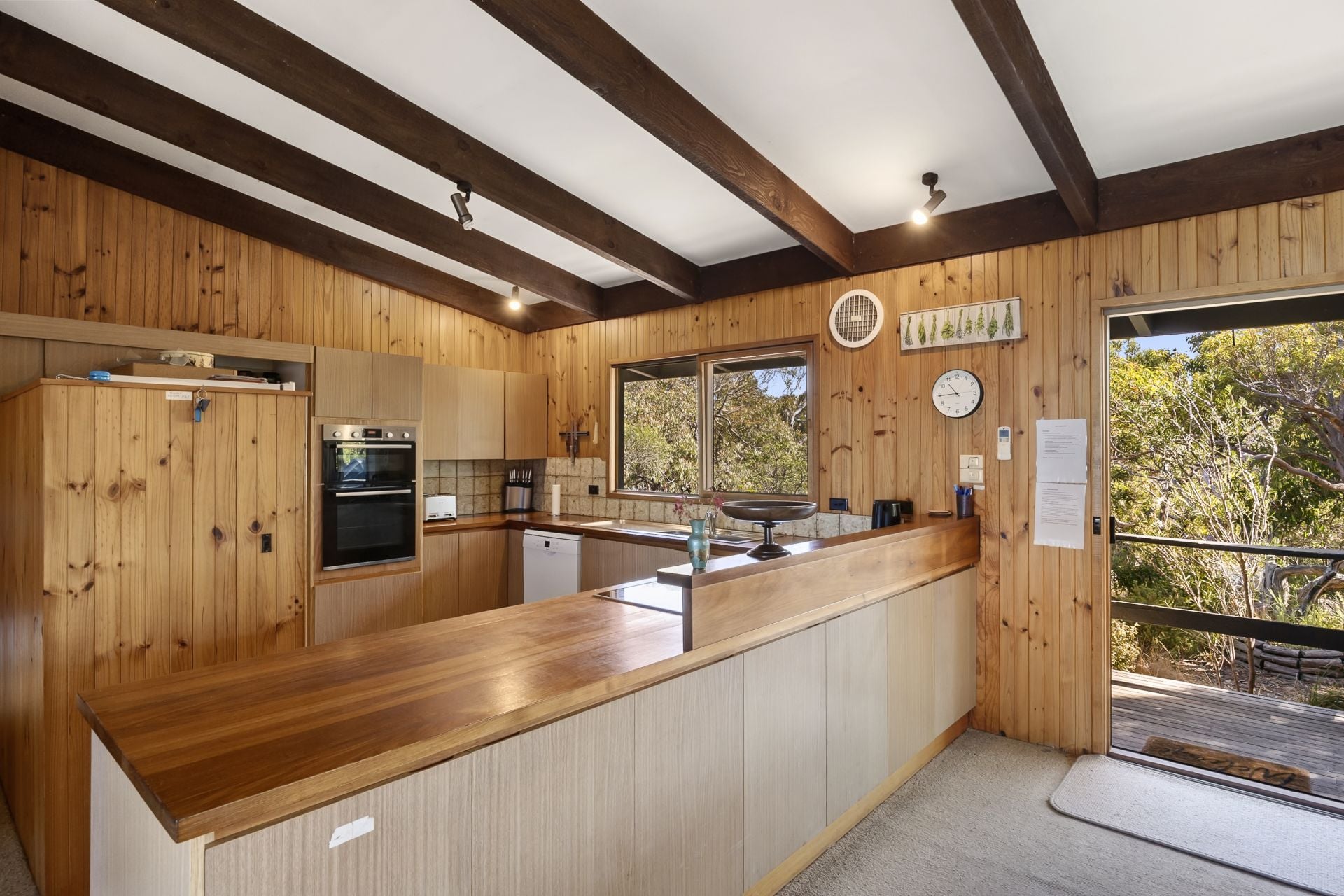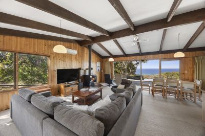 Set high above Fairhaven beach on an expansive 3,650sqm (approx.) allotment, this property is a cherished coastal retreat offering beautiful ocean views, privacy and timeless beach house charm. From its elevated position, sweeping vistas stretch along the coastline toward Lorne — visible from the open plan living zone and two of the bedrooms — delivering ever changing seascapes from dawn through to sunset. The heart of the home is a wonderfully spacious open plan living, dining and kitchen area, where soaring timber-lined ceilings and warm natural finishes create an inviting, lodge like atmosphere. Sunlight pours in through wide windows framing the surrounding bushland and ocean beyond, while a cosy wood fire anchors the living space, making it the perfect place to gather after long beach days. Reverse-cycle heating and cooling ensure comfort throughout every season. The original timber lined kitchen remains full of character, with solid timber benchtops, generous storage and a leafy outlook through the window — a space that feels honest, warm and wonderfully connected to the home’s coastal origins. Perfectly functional as is, it also offers scope for future enhancement should new owners wish to add their own touch, without losing the soul of the home. (Pro tip: paint it internally all white throughout to turn it into a timeless coastal retreat). Sliding doors open to generous outdoor decks that extend the living experience. The expansive rear deck is ideal for alfresco dining and entertaining among the treetops, while the front deck captures some of the most impressive coastal views in Fairhaven — an unbeatable spot for morning coffee, sunset drinks or simply soaking in the outlook.Accommodation is well suited to both family use and holiday letting, with three bedrooms and two bathrooms. A standout feature is the oversized third bedroom, designed as a true kids’ retreat with three built-in bunk beds, its own sitting zone and direct connection to the outdoors. It’s the kind of space that creates lifelong holiday memories — sleepovers, rainy day games and relaxed afternoons after the beach — while easily accommodating extended for family or larger groups. The property is currently a popular holiday rental that is steadily booked by those looking for non urban experience where the bush meets the beach. Inspection by appointment.